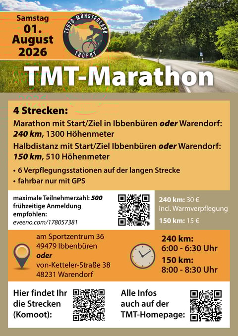 Die Marathonstrecke hat 240 km (1.300 Hm) und führt durch das Osnabrücker Land und Münsterland. Alternativ gibt es eine Halbdistanz mit 150 km (510 Hm).